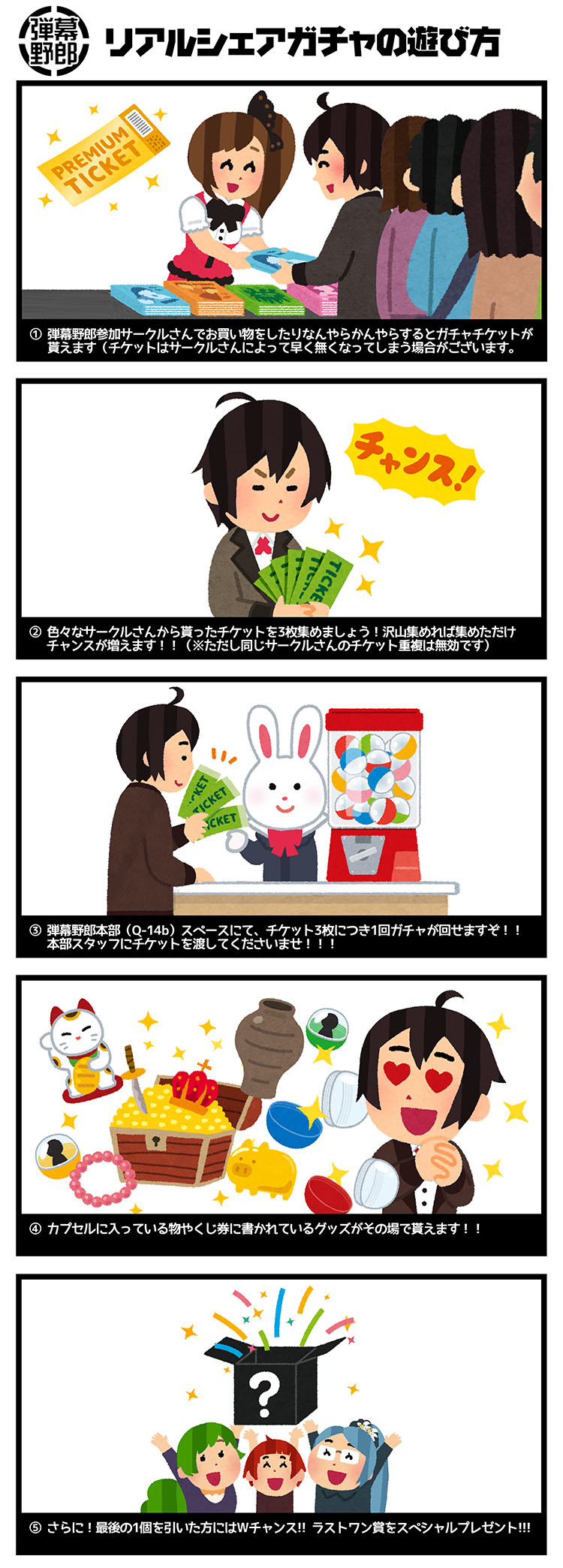 シェアガチャ専用チケットは、弾幕野郎2に参加しているサークルさんから受け取ることができます。チケット配布方法は、各サークルさんごとに異なります。(頒布物の購入や、サークルさんとのお話や、スコアタ対決?等)なお、チケットや景品には上限があります。